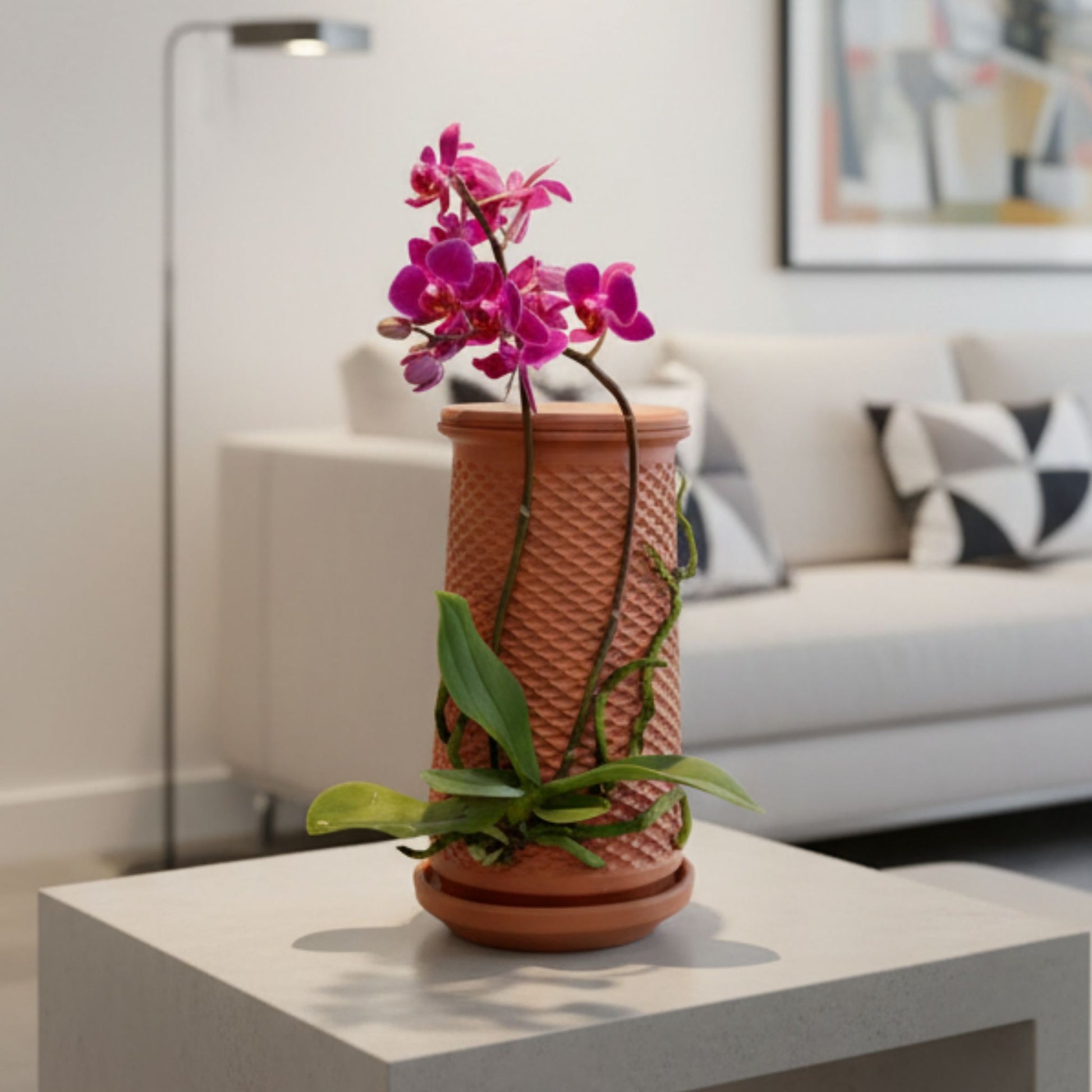 Not just a pot, but a living canvas. Design your own living artwork by fixing any plant you wish to the outer surface using strings or bands.